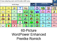 Picture WordPower is also a word-based, generative vocabulary for individuals needing picture support and/or larger cells for access. Picture WordPower consists of single-hit words, category-based words, and spelling with word prediction. Picture WordPower also now includes a Phrases and Categories version - a generative vocabulary option for individuals not able to use a strictly word-based system.